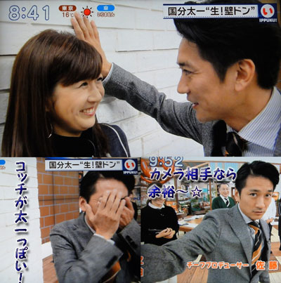 今朝、貯まりに貯まった、雑誌を捨てようと、持ち上げた時、('_'?)...ン?痛いかも?と思ったら、会社へ行く途中から、歩く度にズキズキ。念の為にコルセットしてきて正解でしたが、トイレするのも大変…。夕方には、腰なのか、お腹なのか、胃なのか、判らないような痛みが来て、フラフラ。LIVE後の活力不足が響いてるのかな。全然TL追えてなかったけど、どうやら太一が壁ドンをしたとかいうので、楽しみに(?)「いっぷく」再生。結構真面目にやってるのは、さすが座長。見てるコッチが照れちゃうのは、身内感覚かしら。やった後の、真っ赤になって照れてる太一の方が、可愛くていいね。エンディングは、大好きなカメラ相手だから全然臆することなく、甘ーい言葉♪「大丈夫だよ。明日も逢えるから♪」トキカケでも、壁ドンとか、床ドン(…は、ちょっと難しいか?)でもやってくれるんじゃないかと期待。