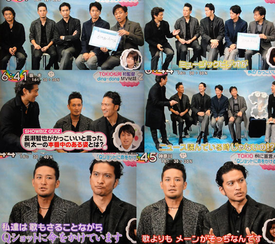 で、「ZIP!」にTOKIO登場。このインタビューは、どういうタイミングで撮ったんだろう?この衣装は、ナンの番組?Winter Songということで、やっぱり「ding-dong」を選びましたね。彼らの言う通り、唯一(ではないんだけど)、メジャーなWinter Songだもんね。一日店長企画を、終わった後知って(リアタイ出来なくて、後で録画で知るという…)落ち込んでたのが、懐かしい。そして、マボ監督第一弾でもあって。メイキングが楽しかったなぁ。屋上で、メンバーに抱えられて落とされそうになる智也とか、パジャマ姿の智也に抱き着くマボとか。…いや、懐かしむのではなくて。「ZIP!」のインタビューは、どうしても達ちゃんが進行補佐になるのね。普段は率先して喋る方じゃないのに、MVがマボ監督だとか、撮影の様子とか、スゴくフォローしてくれるから、伝わったことが多いよね。そこですかさず太一が「好きな言葉はナンだっけ?」とマボにふれば、ちゃーんと判って「2時間巻き」と答え、更に智也が「もう1個ある」と言えば、やはり「撤収」と、バッチリ!ホント、スゴイわぁ。注目されるのが歌のパフォーマンスじゃなくて、Qショットということで、そこもTOKIOはちゃーんと、わきまえてて、求められるコメントを言うとこが、見事。2割しか命を懸けないというパフォーマンスだそうですが、楽しみにしてますよ!