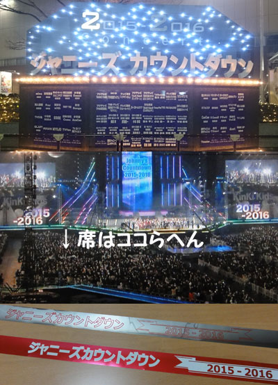 カウコン参戦の覚書を。WEST、ABC-z、優馬・屋良っち、セクゾ、キスマイ数曲歌って、しばし放置され、伊藤アナが出てきて、声出し練習。嵐出てきて、ジャンクション撮影。センターのムービングまで移動して、嵐の曲からのOA開始。ステージ上段に楽器がセットされていたから、TOKIOはそこからだろうと、ワクワクo(゜ー゜*o)待っていたので、演奏用意始めた時には、今年初生ミュージシャンTOKIOだぁ~と、涙が出そうでした。…でも、短っ!さっさと楽器置いてはけちゃって。そしてカウントダウン前に、全員揃った時は、向かって左めが立ち位置だったから、よーく見えて♪光一が太一と握手して言葉を交わした時の笑顔が可愛い~。嵐は曲ふりの仕事があるからか、ステージ上にいる時間が長かったんだけど、「アンダルシア」の時、ステージ階段の脇に大ちゃん以外4人が固まって待機してる間、踊ってたのが可愛かったな。ま、大体、自分たちの曲を他Gが歌ってる間は、やっぱり踊ってるもんね、曲に合わせて。だから、セクゾが「LOVE YOU ONLY」歌ってる間、フローターで移動してるTOKIOを双眼鏡でガン観してたんだけど、「相手は僕しかいない~」って歌った時に、智也がマイク近づけて「ONLY YOU!」ってコーラス入れたのを観て、(^ー^* )フフ♪外周近かった、TOKIフレから、TOKIOフローターとセクゾフローターがすれ違う時に、お互い、手をいっぱい伸ばして、タッチしようとしてたっていうのを聴いたけど、その瞬間は、後ろ横を観る感じになって、ちゃんと見れなかったんだよね。アリーナって、それぞれ、いろんな方向観てるから、気まずいんだもん。TOKIO観察は、出番が少なかったから、あまりないんだけど、「ガラスの十代」を歌い終わって、マイクをくるくる回しながら、はけていくマボの後ろ姿は、やっぱり、みんながマネする歩き方で、笑っちゃった(* ̄m ̄)プッ。「ファンタスティポ」は、まさか智也も踊るとは思わず、表情変えずに黙々踊ってる智也が、ナンか、面白かった。マルはナンで出遅れたんだっけ?この曲の後、つよちゃんが、自分の使ったマイクスタンドを持ってとぼとぼステージを降りてったのも、ナンか、面白かったな。 モンキー3を紹介する前のCM中に、ステージに全員が勢ぞろいしてたんだけど、その時、つよちゃんが隣の智也に何か話しかけ、2人で楽しそうに喋ってて。光一は、隣のアツヒロくんと喋ってたんだけど、気になったのか、やっぱり、2人の話に入ってきて、智也が身振りを加えながら喋ってる事に、楽しそうに笑ってて。たしかマイクが入ってたと思うんだよね、ところどころ、光一の声が聴こえたんだけど、何言ってるか、判らなかったなぁ。そういえば、昨日のKinKiコンで、ドームてっぺんの客に、自分たちがゴマ粒くらいにしか見えないでしょと。長瀬智也ぐらいの身長があれば、もうちょっと見えるのに、と、智也の名前を出してたっけ。今日は、カウコン&初詣の話が出るといいな。