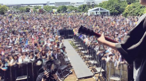 地獄図の次のバンド、KEYTALKオフィシャルから、あの時の会場の様子の画像を見つけ、自分の場所を確認。そして、キラーKから、こういう風に見えてて、結構、Tシャツの柄を確認してもらえたんじゃないかと、勝手に思ってニヤケました。左右ブロックより、真ん中のブロックは、柵が前の方まで出ているので、ホント、最前からは、ステージが近かったんですよ。かなり高さがあって、奥の方にセッティングされたドラムは全然見えなくて、COZYの顔がようやく見えるほどだったので、ドラムに「地獄図」というロゴが入ってるとは、後から画像を見るまで、判りませんでした。会場の映像や画像を見ると、ホントに多くの人が集まってたんだなぁとビックリ。何人っていう発表あったんだっけ?