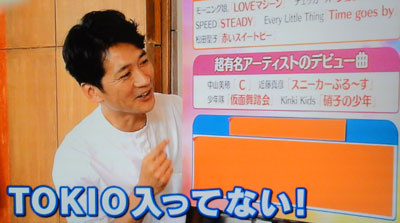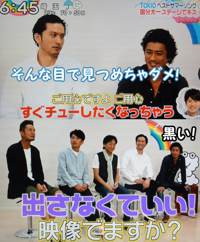 「ZIP!」で、久々、5ショット。いや、トキカケでは観てるんだけど、今回は、音楽番組に出る、Musician TOKIOだからね。夏歌という事で、選んだ曲は「NaNaNa」で、好きな人を思う熱い気持ちが、夏を感じられるし、一緒に歌って盛り上がれるということで、盛り上げていたら、自分も盛り上がっちゃったという太一がしたことというのがクイズに。MAKIDAIさんは、客席ダイブと回答したけど、…ね、答えを「映像出ますか?」と達ちゃんが。マボが却下するも、OAされちゃいましたよ。ま、ナマコ登場前に、客席にスイッチするという回避作でしたが。それから、夏が好きか?という唐突な質問になり、リーダー以外は夏のイメージあるが、リーダーは…という、いつものオチで。夏歌と言いつつ、歌うのは「東京ドライブ」だからね~、トレンチコートの。まさか、コートは着られないだろうから、いつものスーツ姿でしょうか。…