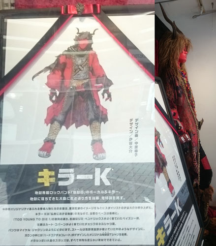 7回目の鑑賞。9時半スタートの初回、半分以上は埋まってたかな。客層は高め。でも、ちょこちょこ笑い声が聴こえて、エンドロールまでしっかりと。まぁ、この映画、エンドロールがMV観てるようなもんだからね、楽しいもんね。観る度に好きになるし、キラーKの表情、そして、声がね、いいんだなぁ。テンション高い鬼っていう事だけど、喋ってるトーンは、低めだよね?「地獄の仕組み…」って言うトコ、毎回萌えるぅ~゚.+:。(´ω`*)゚.+:。 諭すとことか、ニヤリとして「ついて来な」シブい声、たまらない♪…で、ようやく衣装を観に行けたんだけど、昼間じゃ、ガラスに反射しまくりで、全然撮れない~!なので、隙間から映してみたんだけど、顔がよく見えない状態だと、結構リアルで、ミョーにドキドキしちゃた~((´∀`*)) 本当に凝った衣装で、パーツ、どれもこれも、カッコいい。ブーツも、ファーかと思ったら毛糸で、スタッズがカッコイイし、パンツも地模様入ったベロアっぽいのが素敵だけど、これ、暑そう!で、細いっ!Zettai、履けない自信あるわ。下に着ているブラウンのTシャツ、イイなぁ~。衣装は、もう一度くらい観に行けるかなぁ?