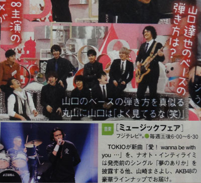 「勤労感謝の日」2回言ってみるほど、不思議な(?)言葉じゃないけど、日々の疲れを癒すのに、祝日はありがたい。といっても、結局いつもと同じ時間に起きて、録画チェックしたんだけどね。で!嬉しいお知らせ発見ですよ☆ 昨日発売のTV誌で、12/3に「ミュージックフェア」に出演することが分かったから、タヒチの楽屋写真が、この番組の事かぁって、納得したところだったので、他にもCXに出るとは思わなかったから、余計に嬉しい~♪前回同様、メンバーだけでトークするだろうから、「自分クイズ」っていうのも、それなりに盛り上がりそう♪…でもさ、来週なんだから、先にお知らせあってもいいよね?太一も、タヒチに載せるなら、言ってよー!