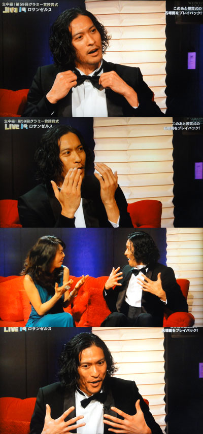 今日は休暇を取って、生中継をリアルタイムで味わうことにして、朝から、((((o゜▽゜)o))) ドキドキ♪しながら、まずは「ZIP!」の待機。番組オープニングから、グラミー賞の話題が出て、前フリもあるから、番組推しを感じながら、今か今かと、待ってると、ようやく、現地中継。でも、智也が出てくるまで、また焦らされて。達ちゃんの呼びかけに、満面の笑みで、手を振りながら「おはようございまーす!山口くーん♪」という智也の登場に、もう、顔がにやけちゃう♪そんな智也に嬉しいような、恥ずかしいような、ワイプの達ちゃん。「蝶ネクタイが似合ってない」なーんて言っちゃってるけど、知ってるよ~、実は、メチャクチャ、カッコいいって思ってるでしょ?そんな「ウチのボーカル」が自慢でしょ?気が合っちゃうから、なかなかレポートとインタビューが噛み合わなかったけど、それも、一生懸命、智也がレポートしようっと思って、そして達ちゃんは、智也からいろいろ訊こうって思っての事だもんね。「長瀬くん」呼びが、いつしか「長瀬」呼びになってるのも、キュッと心に来る、嬉しさ♪