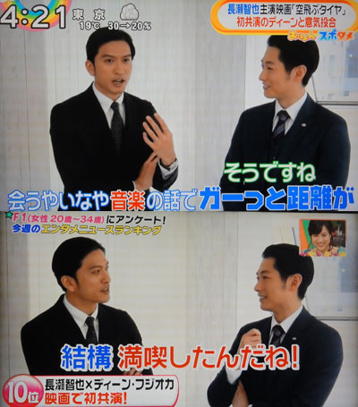 続いては、ようやく、映画「空飛ぶタイヤ」のビジュアル公開。キャスト発表は敵対する相手役のディーン・フジオカのみ。ま、公開は来年だから、いろんな情報が小出しにされるんでしょうね。赤松社長は、トキカケで観ている感じと、さほど変わらないビジュアルで。もっと、ダサくするのかなぁと思ってたけど、全然綺麗ですね。ま、彼はダサくしてるつもりかも知れませんが。こうやって、2ショット見ると、智也が座長の貫禄なんだなぁ。話してる時に動く左手。その薬指に指輪。役衣装だからなんだけど、でも、やっぱり、ちょっと心、ザワザワしちゃう…。音楽話で盛り上がってたようだけど、カラオケボックスで歌った曲を聴いて、「Beastie Boysでスタートして」と言うと、「あ、Beastie BoysでUpして」と智也。どうなのかな、音楽の趣味は合ったのかなぁ?WSでは、「青いイナズマ」の方ばかり、取り上げられてたけど…。