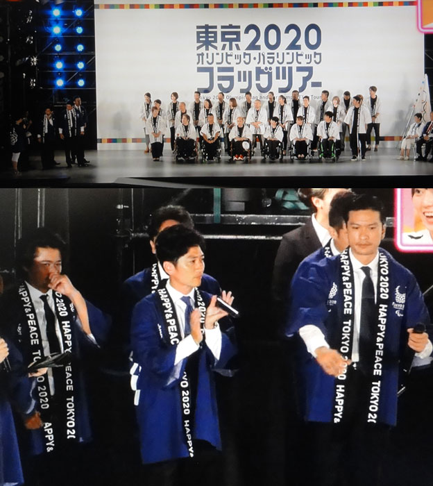 それから、全国へフラッグツアーが回る事や、今日、行われた埼玉と千葉のイベントの紹介や各知事のコメント発表など、式は進んで行くんだけど、その間、TOKIOはステージ下手に木佐さんと一緒にいて、拍手を送って見守ってる感じ。ずっと横顔なんで、達ちゃんの睫毛は、ホントに長いなぁとか、マボのこめかみに流れ落ちる汗に、暑いんだろうなぁとか、ニコニコ優しい顔で観てるリーダーにほっこりしたり、太一もニコニコして、拍手を送ってて。智也が一番ステージ奥だったから、見えにくかったけど、それでも目を細めてキリリの表情だったり、時折笑顔になったり、太一と言葉を交わしたり、マボに後ろから何か言われて振り返って笑顔になったりと、ずっと見ちゃった。そして、フォトセッションになり、ステージにパネルと、椅子が並べられ、上手に太一と達ちゃん、都知事やお偉いさん(?)が真ん中に来て、その脇に智也、マボ、リーダーとアンバサダーの方が並んで。智也とマボは、カメラとか、いろいろ指さして喋ってて、リーダーは隣のアンバサダーの方と、笑顔で喋ってて。カメラに目線を、と言われると、その方を (σ・∀・)σって指差して。今回は、そんなアチコチとは無かったけど、それでも、右、とか、上の方とかって、言われる度に、カメラの方角を指す、仕草が、どれもカッコよくて。きりりの表情だったり、かと思えば、後ろに立ってた、三宅氏の言葉にツインタワーが反応して、笑ってて。マボ、顔を赤くして笑ってたよね!?智也の笑い声も届いたし!そして、後ろのカメラに客席も映るという事で、席から立ち上がり、後ろを向いて、指で「3」を作り撮影ってなるんだけど、ステージの5人が気になるから、早く終わって~!と思ってました。(智也の「3」って作った時の、小指が、ナンか、他の人とちょっと違ってたんだけど、再現出来ない)フォトセッション終わって、また映像が流れるというので、退場する面々。コレで終わり⁉と思ったけど、〆の挨拶みたいのもなかったしなぁ・・・と、不安に思いながらも映像終わるのを待っていると、来ました!5人が登場!そして、ようやく、リーダーメインで喋り始めましたよ♪プロジェクションマッピングの最後が花火だったから、「今年初の花火、見えました。2020TOKYOが待ってるというのは、もう、ワクワクしますね」と。早く始まって欲しくなるという木佐さんに、マボが「3年って、あっという間ですからね。ホントに僕らもあっという間に、歳とりました」と笑わせて。太一が「今、このテンションだったら、3年後、どんなテンションに、自分たちがなってるのか、抑えきれてるのか?」と。だけど、「出来たら、出たいなっていう気持ちも」と言うから、達ちゃんが「(笑)オカシイでしょ!」慌てて太一が「いや、どんな形でもいいんですね、ナンか、協力出来たらなと思います」達ちゃんが「この3年の間に、また、あの、ニューヒーロー、ニューヒロイン、が出てくるのも、スゴく楽しみ」木佐さん、すごいなぁと思ったのが、ちゃんと智也にもふってくれて、「わくわくしながらカウントダウンしたいですね」って言ってくれたから、「僕らは盛り上げる事しか出来ないんで、全力でやらせて頂きます!」と宣言。木佐さん、最後も笑わせてくれてたね。