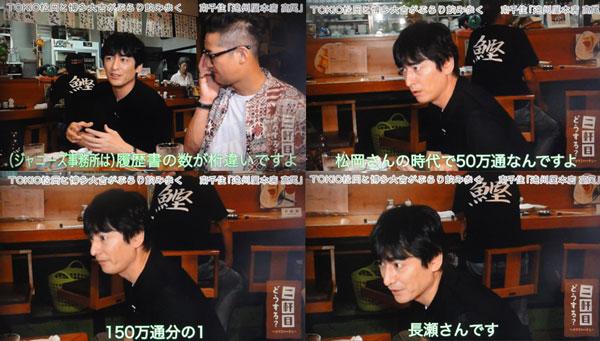 長瀬智也がジャニーズ入りした際の倍率…博多大吉が興奮気味に明かす】大吉さんも酔ってたけど、マボも相当キテたよね~。マボがトイレに行ってる間に、ジャニーズ事務所履歴書ネタ。こういうのって、事務所から聴いて、マボは知ってたのかしら?何通来て、何人受かったとか。オーディションで何百人っていう話をしているので、必然的に、履歴書も、そういう数字になるんだろうけど。