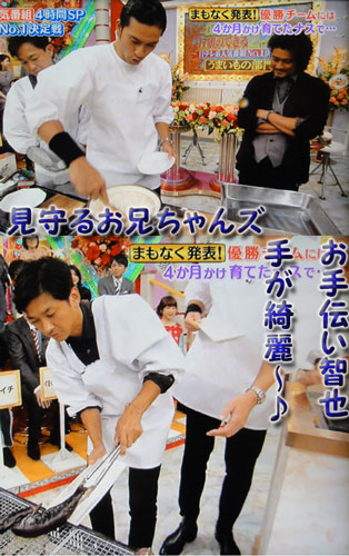 企画本気。…って、番組Pからの指示なんでしょうけど、言われれば、それも楽しんでやるのがTOKIO。結局、この、長茄子の成長過程を見せる事は、TOKIOが17年間、明雄さんと頑張ってきた事を、みんなに知らせることにもなってるから、番組としても、TOKIOとしても、良かった事なんだろうな。久々、割烹着姿の智也。調理には関わってないのがほとんどだけど、よく通る声で、説明したり、食材訊いたり、マボの料理が上手くて、美味しいって褒めたりと、立派にお仕事してます♪マボの麻婆豆腐、食べたいなぁ~☆もちろん、智也がよそってくれた、新男米でね。