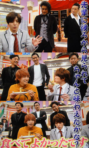 苦労して長くした茄子は、ネタみたいだけど、後輩にご馳走する形になって。ズラッと後ろに先輩に並ばれた中で、食べるという、なかなかのハードルの高さでしたが、そこは、デビュー10周年ともなれば、ちゃんとコメントは言えるのね。「ストレンヂア」の話題の後だから、知念くんの変貌(?)には、感慨深いですが。