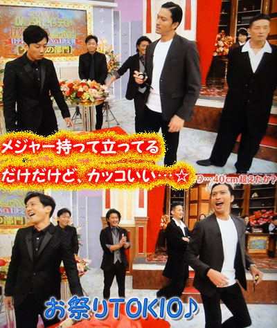 年々、TOKIOの出番が減ってる感じがしてくる、この3番組合体SPだけど、番組対抗となると、TOKIOの結束力が出てくるから、それはそれで嬉しいんだよね。ただ、メジャーを持って立ってるだけなのに、こんなに絵になるって…。そうだ、昨日のセレモニーの事で、書こうと思ってた事。ナンの時か、忘れちゃったけど、立ち位置の事かな、スタッフに言われて動くのに、場所確認に、手で示す仕草が、日本人離れしてるの。もう、わざわざ言わなくても、ナンだけど。全ての仕草が、絵になって、様になって、その形を含めて、メッチャ、オトコマエ。こうやって、5人が綺麗な衣装を着て、揃っていれば、やっぱり、TOKIOはカッコいいなぁ~ってなるのに、ふざける事、楽しむ事は忘れない。素敵な5人だー!