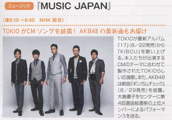 その後は、実家に寄って、従妹と、その母である叔母と、ケーキをTOKIO食いしながら母の誕生日お祝いをしました。母が買ったオリスタには、行きたいLIVE、また行きたいLIVEのアンケート結果がありましたが、TOKIOの文字は見つからず。アルバム予告もなく、寂しくなってしまいましたが、音楽番組出演記事を見つけてテンションあーっぷ!…ん?26日ですか?…去年と一緒じゃん!LIVE初日にTV出演って!去年はOA時間が遅かったからホテルで見たんだっけ?今度はLIVEとバリバリかぶるのよね。またPerfumeとの楽しいトークが見れるかな?