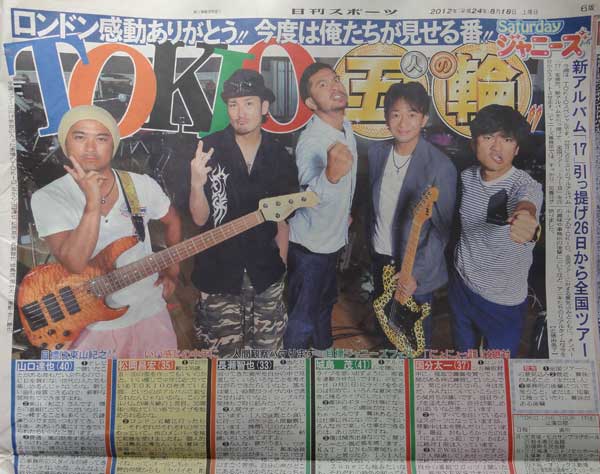 ニッカンの「Saturdayジャニーズ」にTOKIO登場。うん、判ってましたよ、決め顔で登場しないっていうのは。全国ツアーに向けて「気合」の入った表情だそうです┐('~`;)┌。①全国ツアーへの意気込み②最近興味のあること、人③事務所の後輩について、という3つの質問にそれぞれが回答。「聴いたことがある曲もだいぶやる」(@達ちゃん)のかぁ…。ちょっとでいいのに。メンバー新作全てやって欲しいくらいなのに。それにしても、Sexy Zoneはネタ扱いね。太一がNEWS、マボは(やっぱり)森田剛と名前を挙げる中で、リーダー&達ちゃんがSexy Zoneの名前を挙げてる。リーダーが提案した「ジャニーズフェス」賛成!…あ、やるならJフレ+αだけでいいですけど。