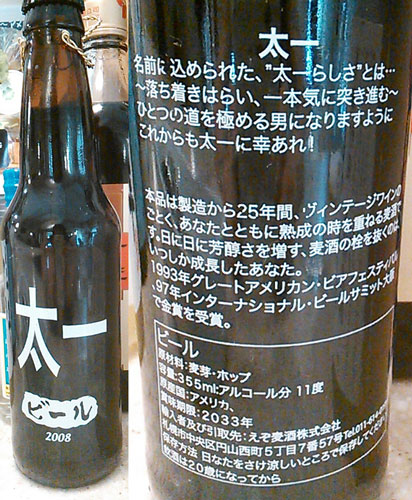 ランチに入った店に置いてあった「太一ビール」。前に気付いて、写メしたことあるんだけど、今日はホントに目の前だったので、裏をパチリ。賞味期限が「2033年」って!製造後25年間、置いておける、ビンテージビールだって。飲んでみたいような、恐いような。それにしても、ココに書いてある「太一らしさ」って、TOKIOの太一とは、ちょっと違うね(* ̄m ̄)プッ。「一本気に突き進む」というのには納得するけど、「落ち着きはらい」っていうのは、太一から一番遠いトコにあるもん!オリンピック開催地決定特別番組のMCをするそうだけど、東京に決まったら、CXのオリンピック特番のMCは太一よね!?東京五輪なら、テーマ曲もTOKIO(東京)でしょっ!