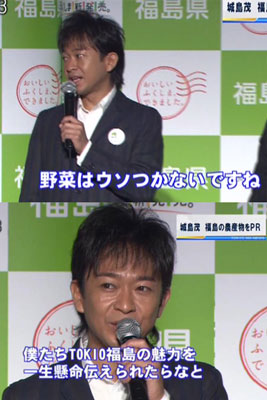 ロックバンド「TOKIO」のリーダー城島茂が東京都内で開かれた福島県の「新生!ふくしまの恵み発信事業」記者発表会に登場した。TOKIOは原発事故による風評被害が続く同県の農林水産物をCMでPRする。佐藤雄平知事も出席した。