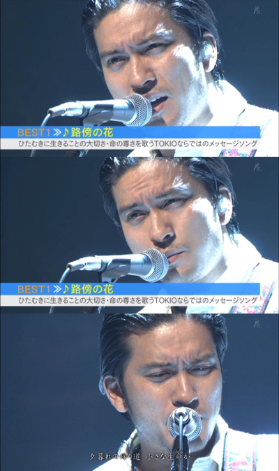 『路傍の花』はもちろん大好きで、ずっと聴いているけど、こうやって映像をあらためて観ると、この視線に、歌う表情にまた惚れちゃいます♪この本放送の時は、3/11の後、LIVEが中断され、再開されるLIVEの直前の放送だったから、LIVEのもヨカッタんだけど、このプレミアムの方がグッときてたんだったなぁ。TOKIO曲リクエスト1位は納得だよね。またLIVEで歌ってくれるといいなぁ。歌って欲しいと言えば「Cross Fade」も、また聴きたいんですけどー!OVER 30'Sは5公演しかやってないからね。そうそう、マボが感謝祭出てた時にトカゲのピアスをしていたけど、前にしてたなぁと思って探したら、この時期だったんだよね。PLUS LIVE TOUR初日放送のMusic Loversでしてたんだった。奇しくも、今日がMusic Lovers最終回。また音楽番組が終わっちゃうんだ。でも後番組も音楽番組だったよね!?歌ってる智也を見たら、Musician TOKIOにますます逢いたくなりました。