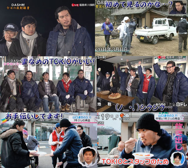 VTR開け、ドラム缶ストーブ越しのTOKIOが映った時、胸がきゅッとなる。そして、今まで放送されなかった、地震発生時のDASH村の様子。バタバタするスタッフや、恐怖を感じてるお母さんたち、揺れる車に崩れる山。見てるだけで怖かった。ワイプの中の智也も、そんな顔してたね。こういう映像、太一やマボや智也は、今日初めて見るのかな?まぁ、この日にリーダーと達ちゃんが村へ行った映像は、初めてだろうけど。見慣れている村の風景に懐かしさを感じてるメンバーの表情や言葉にグッとくる。夏の草がボーボーになってる風景と違って、雪に覆われてるから、余計に以前と変わらない景色になってるんだろうね。村での様々な新たな試み。本来ならZettaiあり得ない、機械だらけの村。いつもなら「コレも手作り~!?」っていうようなモノまで作ってるのにね。でも、研究者の方々がDASH村に多いに興味を持ってくれて、村の未来の為に動いてくれるのは、有難いね。こう言っちゃナンだけど、こういう企画を持ち込んでくれるから、DASH「村」を続けていけるとも言えるよね。「ZIP!」で流れた、メイキング(?)。智也がカレーよそってるのが意外だったわ!マボなら判るけど。この時はまだ太一が名古屋から来てなかったのね。放送やるからと、いつものようにお手伝いに来てくれる、心強い仲間の方々。