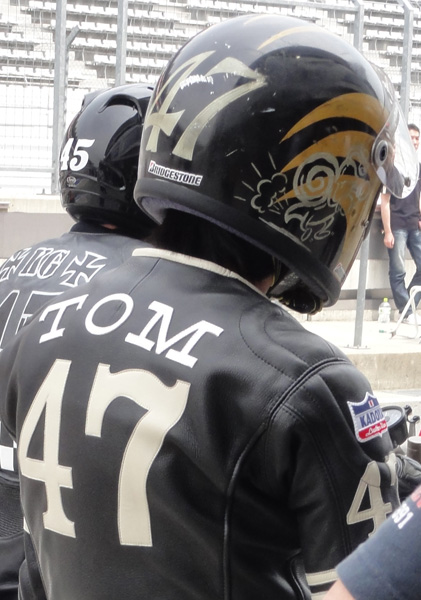 遠いし、行けないなぁって思ってたのに、New「47」の画像見ちゃって胸がザワザワ。諦めるつもりでアクセス見たら、ん?つくばより交通の便はいい??って思ってきちゃって…ヾ(´ε`*)ゝ 行ってきちゃいました。「やっぱりね」って声が聞こえてきそう…(;´▽`A``ところが甘かった!レース場へ行くバスへ乗ったまでは順調だったのに、そこからが散々。足、棒になりました。パドックへ着いてからも、ドコ?と出走準備時間が迫る中、ドキドキしたけど、ナンかやっぱり呼ばれる感じ?がして歩いていくと、お仲間発見。ココのパドックは建屋内なんで、皆さんいるところが暗い。うーん、ココはあまり長い時間、じーっと見ていられない場所かも…。智也の姿がないなぁって思って、キョロキョロしてたら、いきなり、キャップかぶってバイクに乗って智也がキタ━━━━(゚∀゚)━━━━ !!!!!ニッコニッコの笑顔で仲間の元へバイクを寄せてきた。いきなりの登場で、喜びのあまりカメラ出し損ねて、見送っちゃったよ。ナンか最初見えた時、顔がシュッとしてて、一瞬、智也だよね…?って感じだったの。すぐに着替えを始めて、またパンツ姿見ちゃった…。
