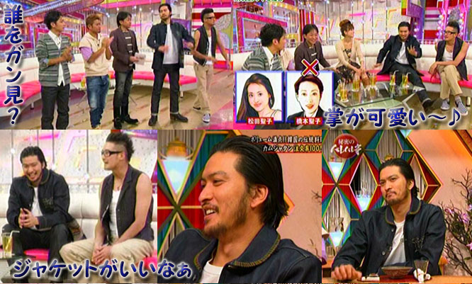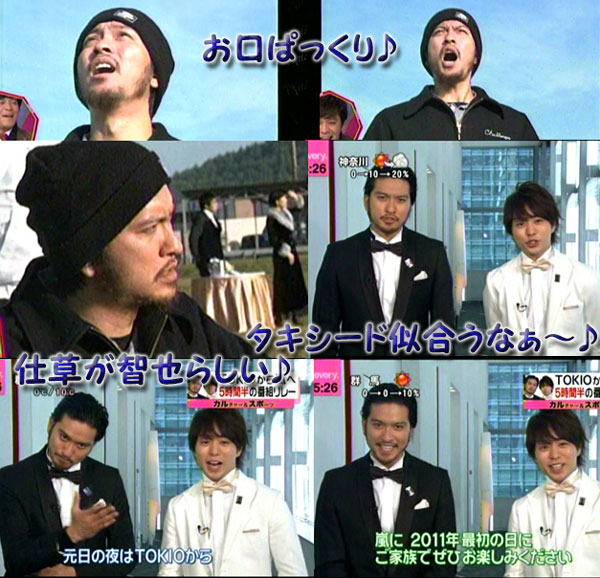 ナンて愚痴はおいといて。撮って出し状態の5LDK。収録は12月1日だったんだよね。この4日後がHRS。そういえば、横浜ではニットキャップだったから、髪の毛がほとんど見えない状態だったけど、お店で会った時はキャスケットだから、髪の毛出てたんだよね。あんまりイメージないんだけど、智フレがちょっとウエーブかかってたって言ってたの。多分整髪剤を付けてないから、ほぼ真っ直ぐじゃないかと思うんだけど、どうなんだろう?マボは結構伸びてるね。お願いだから、紅白の時に線を頭に入れて来ないでね!達ちゃんのタヒチ焼けは、もう落ち着いてるかな?リーダーのブーツが可愛い。智也のジャケットも、袖だったり、裾だったり、ナンか模様入ってて可愛いね。崇志コーディネート?