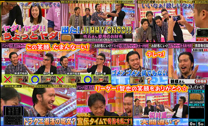 もう、ナニから、どう書いたらいいのか、軽く、いや、かなりパニック。先ず順を追って書くと、3時頃に幕張メッセ到着で座席指定券と引き換え。AかBかを選ぶんだけど、やっぱり席運悪さを大発揮。このところの遭遇率の反動かな。2階席を引当て、( ̄_ ̄|||) どよ~んとしたけど、入ってみれば、案外小さいホールだったので、肉眼で十分の距離。そりゃ、アリーナ席だったら、ご覧頂いたように、近くに現われますけどね。TOKIOは固定だから。そしてまさかの早々の出番。一気にテンションが上がりましたよ、スクリーンに出た時は。相変わらず、何かしないと気が済まない5人組。そしてステージに登場したら、もう美ジュアルにキャー~ヾ(*≧▽)ノ彡ナニ?あの、美人さんなギタリストは!足細い!長い!可愛い~♪OAではココでCMに入って約2分以上あったでしょ?現場では、やりたい放題、言いたい放題でしたよ。太一とマボがバードや翔をイジる!イジる!「ハットリさん!」とか「お前はナンでもソツなくこなすね~」とか「櫻井さん!櫻井さん!」ってスタッフみたいに言って、翔を脅かしたり。「汗大丈夫?」(だっけ?)と心配してるのはリーダー。翔が汗押さえに行こうとしてるのに、太一が行かせないから「太一くんが行かせてくれないんですぅ」って訴えてる翔。ハンカチ(?)は太一が先に使ってるし!ツボったのは、突然リーダーが「CM開けまで30秒です!皆さん宜しくお願いします」って、スタッフに代わって言ってるの♪相変わらずの気配りさんですが、とにかくリーダーが可愛くて可愛くて。智也は「はっ!はっ!」とマイクテスト始めてて、イヤモニの調子を整えてる。そしていきなりCM開けに「ズームイン!」ナンか、みんなテンション高かったです。で、スタンバイお願いしますって言われたことでコッチはテンション上がってたから、リーダーの爆弾発言、全然気付きませんでした。リーダーが何か言った?って感じだったけど、誰もフォローしないし、客席の反応は、その言葉にというより、スタンバイするTOKIOみんなにキャーキャー言ってるという感じだったんですよ。久々にガッツリジャンプして、手振り上げて、短い時間だったけど、ライブ感を味わえて幸せ~♪
