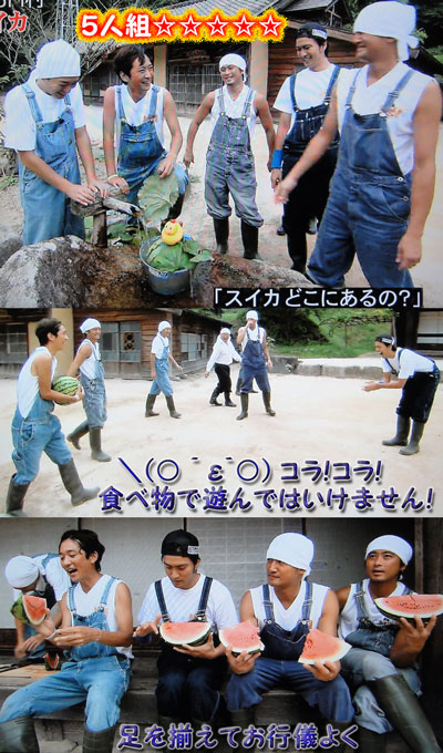 もしかして?と思って高レートで録画してて正解!(普段はアナログLP…!)村に5人組再び画面登場ですよ♪智也がいることは、やっぱり特別なのか、スイカの収穫を智也に促してるもんね、太一。スイカの方が大きいに決まってんじゃん!智也の顔より。5人揃ってる嬉しさのあまり(違うか?)、スイカ投げちゃうマボ。太一、受け止めるのに必死だったでしょ?智也がそれ見て大爆笑。…不謹慎ながらも、大好きな光景になったから、大目に見て♪リーダーが用意できてないのに、さっさと食べちゃう4人も、それが当然の様なリーダーも、TOKIOっぽくて好き♪毎回とは言わないけど、5人が村に揃ってる姿、定期的に見せて下さい!お願いします!!