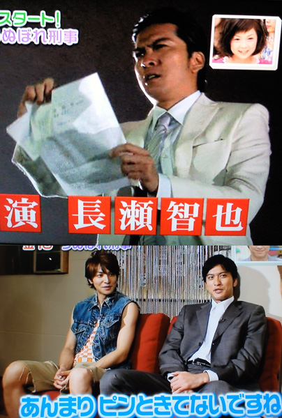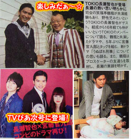 TVガイド表紙の撮影エピソードがインターネットTVガイドの「COVER STORY」に載ってます。あと、半信半疑だったけど、「ひみつの嵐ちゃん」に、うぬぼれ5、ご出演決定なのね!?夏の合コン勝負服のコーディネート対決。斗真はA型で真面目だから、同じくA型集団の嵐ちゃん達と似たようなコーディネートするんじゃないかと思うし、カナメンも、三津五郎さんも、それなりの格好しそうだけど、心配なのは智也&矢作。違う意味でのウケ狙いしそう。ま、選ぶのが誰か?ってトコだけど、ファッション誌モデルなのかなぁ?お願いだから、押切もえ&藤井リナだけは出さないで…とっても苦手です。テレガイは全然だったけど、TVぴあや、テレビジョンは24時間TVドラマの写真も載せてくれてたね。ホントに全然、うぬぼれさんのカケラもない姿。さすがだ。智也パパを見るのには、随分待たされるね。