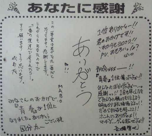 どうなることかと思いましたが、2年7か月ぶりにオリコン1位獲得ですよ♪前回の「青春」の時には、メンバーからお礼のハガキが来たんだよね~♪今でも手帳に挟んで持って歩いてる。カード外れちゃったから、印刷でいいんで、直筆のメッセージ、送ってくれないかなぁ~。達ちゃんの「Riding!」での素直な「嬉しい