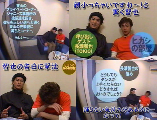 98年のめちゃイケ映像がないかなと、ビデオをゴソゴソ探っていたら、アレ?コレ、ナンだっけ?というタイトルを見つけたから、またまた見ちゃいました。2001年4月末か、5月かな?少年隊の「少年タイヤ」に番宣で出演の智也。事務所の後輩がヒガシ先輩に悩みを相談するというコーナー。「大人になったね~」としみじみ言ってるヒガシ先輩。座って映る位置を確認してる時に、「東山さんって顔小っちゃいですね!ビ、ビ、ビックリしました!」カメラの位置の関係もあると思うけど、でも、やっぱり小さいね~。「悩みはいっぱいあるんですけど」「ありそうだなぁ~!城島の髪型が気に入らないとか?」と智也が喋る前に訊いちゃう先輩。それにのって「リーダーは、最近痰が絡むんですよ、よく」という告白に先輩「おじいちゃんじゃないんだから!」と崩れてます(* ̄m ̄)結局、相談事は、「踊りたい気持ちはやまやまなんですけど、いくら踊っても、上手くならないんですよね…」ホントかぁ!?と思いますが、これに対する助言(?)をいろいろ格言が載ってるらしい「希望の書」という中から、「会社で働くなら知恵を出せ。知恵のないものは汗を出せ。汗も出ないものは静かに去って行け」を引用。それを聴いた智也、一瞬固まるも、「頭を使ってもダメだったら、汗流してガンバレ!と。なるほど」と納得。ヒガシはホントに智也に一目置いてるんだなぁ。「長瀬は才能ある人だしさ。見た目もいいし、ルックスもあるしさ」って言われて、智也がちょっぴり嬉しそうな顔してるのが可愛い~♪