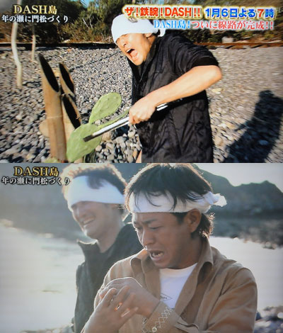 お正月飾りを準備するリーダー&マボ。門松の下の縄に、七五三っていうのがあるのを知りませんでした!KinKiコングッズを購入行列の途中のドームのビジョンの下に門松があって、「あ、コレ、2本しかない。2と3だ」って、同じくDASHを見てた母が見つけました。それにしても、松と梅の代わりがウチワサボテンって!確かに赤い実がアクセントになるけど…。サボテンのトゲに悲鳴をあげて「お母さん!お母さん!」って叫んでる乙女ドラマーが可愛いです。心配そうに覗きこみながら見守るリーダーも、結局はトゲの餌食。ま、彼の場合は進んでささってるって気がしないでもないですけど。