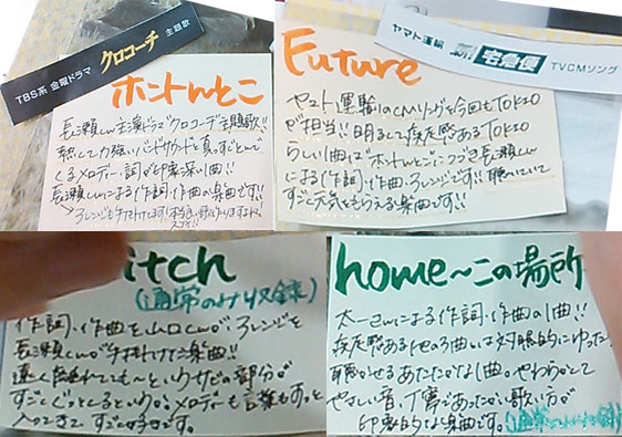 お会計をしながら、「ポップに書いてくれてるんですね♪」と言ったら、そのレジのお姉さんが書いてたみたいで、「ちょっと間に合わなかったんですが(;^_^A 。このジャケットが素敵だから、拡大コピーして」作ってくれたそうです。「爽やかすぎませんか?」とつい言っちゃったら笑って「コッチ【初回限定盤1】はカッコイイ感じですよね」とフォロー(?)してくれましたが。更に「曲、いいですよね~。メンバー、みんなスゴいですね~」って言ってくれて、飛び上がる位嬉しかったです♪「このポップの写真撮っていいですか?」って言ったら、「いいんですか?こんなので」って。いえいえ、スゴく立派ですよね!?お店の方の、こういう協力、ありがたいです。…だからさぁ、本人たちのプロモも、もう少し時間を割いてくれてもいいんじゃないのかなぁ…。智也やマボが役者で忙しいから、キツいとは思うけど、せっかく出来上がった、こんなに素敵な曲たちを、もっとたくさんの人に聴いて貰う努力はしてもいいよね…。