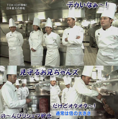 飛鳥の大きさを見せたかったからなんでしょうけど、あんなに揺れる船に乗って、せっかくの衣装の上から救命胴衣を付けさせての撮影が必要だったのか!?と…。ま、それはさておき。広報のお姉さんが説明してても、ナニやら盛り上がってるツインタワーに萌え~♪もちろん、シェフTOKIOにもですよ!先輩Gは毎週のように、こういう恰好してるけど、TOKIOは割烹着はあっても、シェフ姿は珍しい?あ、マボは何となく見覚えある気がする。「ドーン!」ってお肉を鉄板に置いて、マイペースな智也に周りもほのぼのしちゃってるよね~。「うぇ~い!」とか言っちゃって、マボにツッコまれてるし。