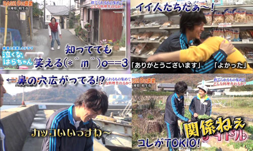 「0円食堂」にまたまた後輩参戦。棚ボタ的に、はらちゃん登場。まだ1年だけど、こうやって見ると、もっと前だったような感覚なのは、クロコーチのイメージが強くなっちゃったからかしら。マルはリーダーを尊敬しているって言ってたし、TOKIOとの相性はいいと思ってたけど、マルのいいとこ、たくさん見て貰えたんじゃないかなぁ?『うまいか』加工所の人とホッとして抱き合っちゃって、二人ともイイ人♪太一がビュンビュン先輩風吹かせてるのも面白かった!大根の葉を貰うとことで、「アイドルですから!」と止める後輩に「関係ねぇ!」とバッサリ。そうでなくっちゃ!(* ̄m ̄)