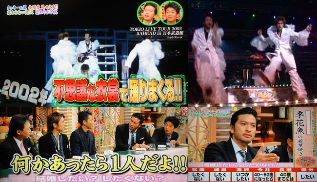 マボの゚.+:。(〃ω〃)゚.+:。 キャァ♪って場面になるってトコで、母から電話。明日から名古屋へ行くという報告と、ここ数日体調が悪かったという報告も。手が痺れて、言葉も喋りにくくなってということで、脳こうそくが疑われ、CT撮ったら、その兆候はないので、首に異常があるのかもと言われたと。来月にMRI等、検査をするようで、薬をもらってるというのを今頃言うからビックリ。弟には連絡して、彼が顔出してくれてるようで助かりましたが、ナンで連絡くれないの?と言うと、言ってもしょうがないし…と。私がいろいろTOKIO事でいっぱいいっぱいだから、気を使ったんでしょうか。何が出来るかっていうと困るんだけど、電話を切って後、ナンか、動揺しちゃって、せっかくのマボドラマもうわの空になっちゃいました…。日々忙殺されて、母の事も気遣えなくなってたから、ちょっと考えなきゃ。久々、トキカケの事を書こうとキャプチャをいっぱい用意してたけど、ナンか、編集も出来ず、ただ、「不思議な衣装で踊るTOKIO」とメンバーの結婚観については書いておこうと。