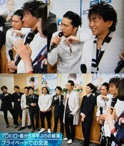 えーと、24日は「SHOCK」を観て、即行帰宅で、「フラジャイル」に間に合って。その後のトキカケも、楽しくて。…あ、でも、紹介VTR系、もっと削れるでしょ?っていうか、なくても良くない??相変わらず、その後、OAする分を見せる意味、判んないし。その分、トーク長くしてもらいたいんだけど。っていうのはおいといて。告知もしてるし、目玉企画のような取り上げられ方してたから、もしかして?と思ったら、久々に「ミニステ」、喋る時間を貰えました♪ちょっと前までは、必ずTOKIOがカラミ役だったのに、大人数女性Gにその座を取られてたので、嬉しかった♪やっぱり、嵐は近い後輩だし、TOKIOといい関係出来てるのが伝わるから、この2グループのカラミは、観てて気持ちいいモンね。でも今回は、ナンと言っても、この、リーダーの肩に手をかけてる、Sexy智也にヤラレましたよ…゚.+:。(´ω`*)゚.+:。リーダーも美人さんだし☆