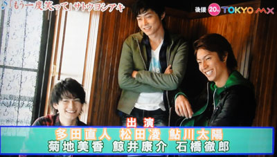 最終回ラストの直後、映像販売決定と出て、早くも7月に入手出来るようで、こういうメイキングがたくさんあればいいのになぁ、と、イベント事を入れると、撮影風景は少ないかもしれないけど、120分の内容に想いを馳せます。ネクタイ結ぶ智也、体の厚みが薄くなったなぁと。お弁当を覗きこむのは、サービス精神からよね~。カップを持つ手の美しさ、そして、インタビュアー(?)の問い掛けに、耳を傾ける姿、ホントに絵になる。智也は、誰にでも、ちゃんと聴く姿勢を取るのが素敵なんだよね。ひな壇にいても、後ろで喋ってる人がいれば、その人に身体ごと向けて、聴いてる。こういうトコ、大好き♪