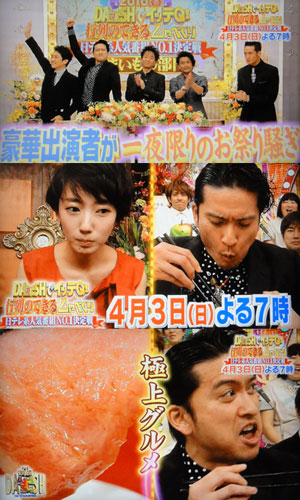 DASHは美味いものNo1決定戦!溶岩ステーキ、幻の駅弁、女子高生マグロ解体、世界一ラーメン実演▽19:58頃…イッテQは珍プレー好プレー映像!大野・二宮痛恨ミス&吉田沙保里リベンジ参戦!ジャニーズ大暴れトマト投げ祭り対決▽行列は妬み嫉みGP!因縁の相手を実名発表!桝vs羽鳥vs藤井アナ!静電気実験で剛力・多部絶叫▽しゃべくりは…質問箱ベストテン!有吉が亀梨に、森三中が田中みな実に禁断のアノ質問!