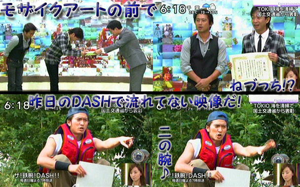 日テレさん、あまりに謙虚じゃないの!?国土交通省から表彰されたってこと、5時台の新聞記事紹介と、映像は6時台1回だけですかぁ??(あ、高速早送りだから、もしかしたら、スッキリ!やPON!やDON!やミヤネ屋でやったかもしれないけど、私の動体視力では確認出来なかった)それに、BGMが「遥か」じゃなくて、「NaNaNa」だし。もちろん、彼らの本業は、こういう事に一番時間を費やすことじゃないと思うけど、やるからには、形する!っていう姿勢は、褒められるべき。DASH海岸だけじゃなくて、村だって、その他の体張った企画だって、芸人イジメみたいな番組が多い中で、貴重な番組だと思う。まぁ、それゆえ、足かせになってることも否めませんが…。