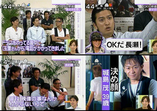 やっぱりオリコン予想通りの、デイリー1日目。TOKIOは(今日は)ズームだけなのに、本命が、ズームも出るし、DON!にも、everyにも出て、独占インタビューとか受けてるんだもん、キビシイ戦いになるのは、明らかだけど、こんなに素敵なカップリングが入ってるんだから、多くの人に聴いてもらいたいね。7時台にたっぷりやってくれると思っていたのに、そこは本命さんに取られちゃったので、7時前のエンプレに登場。アナログ録画、開始時間設定が42分だったから、CM前のとこ、録画出来てなかった…(BDでは撮れましたが♪)。マボがドラマをやってる最中に出来たっていう電話がかかってきたって言ってたけど、デモキン様の撮影だよね?TOKIOの代表曲を作る!と意気込んでいたので、「出来たぞー!長瀬にピッタリだ!」と言いたかったのね。レコーディングに来てくれたことを智也が話してると太一が「すごい褒めてくれたんでしょ?」って。そうなんだ!達ちゃんが「どんな感じで?」と聴くと、普通、何回かTakeするのに、1回歌ったら、「OKだ!長瀬!!」と、(o^-')b グッ!サインだされたんだって。ナンか、このインタビュー、玉置氏について語る、みたいになってますけど!?でも、PVの話になって、メイキング用カメラを意識するメンバー1名の話題に。それが、この「キメ顔リーダー」。相変わらずオチです、リーダー。