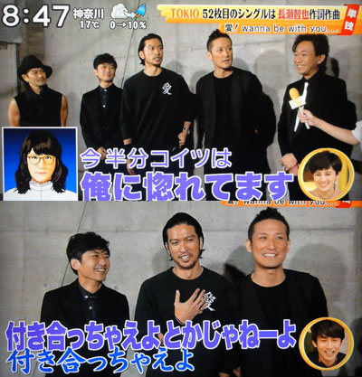 今回は、いろいろ楽しかったなぁ~!最近、ゆっちがインタビュアーで来ないのは残念だけど、ベスアーの現場じゃ、無理もないもんね。一応、曲について、智也に喋らせてくれたし、他局だけど、マボドラマの事も言ってくれたから、太一も加わって(?)ツインタワーのLOVE2っぷりも観れたし♪何より、リーダーいじって、爆笑してる4人っていうTOKIOが、ホントに平和で、嬉しくなっちゃいました。マボが(笑いすぎて)涙を溜めながら「オレたちはね、こんなリーダーをもって、幸せです」って愛を語っちゃってるのは、智也が作った『愛!wanna be with you...』のチカラだ!