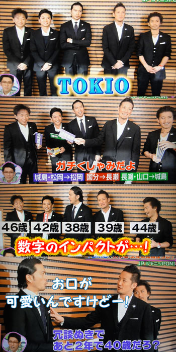 マボから、言わせると、智也は「若い!」んだって(^ー^* )フフ♪自分でも、年齢を記入する時、ビックリするけど、こうやって、年齢が表記されると、ウワッてくるよね…!智也があと2年で、40で、その2年後に、リーダーが50って、こういうやりとり、10年前、Over 30'sの時に言ってたよね~。20代がいなくなって、みんな30代になるって。智也が30になったら、すぐリーダーが40になるって。長い時間、一緒にいれてるんだなぁ…。まだまだ、一緒にいられるよね。「ZIP!」でカンレキーズ(THE ALFEE)のインタビューがあったけど、42年活動してるバンドが存在してるんだから、TOKIOも追い抜く勢いで進んで欲しい~☆