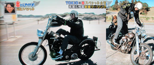 もう明日から仕事が始まるという事で、心落ち着かなくなって、焦って、ちゃんとブログが書けなくなってて、マズい…。頭の中には、いっぱい思ってる事、書きたい事があるはずなのになぁ…。 「嵐にしやがれ」TOKIO×嵐企画。昨年末に相葉ちゃんが、大型バイク免許持ってるから、一緒にツーリングして、肉食べたい!って智也に直訴して、「断る!」と即却下された企画が、スペシャルだという事で実現。待ち合わせ場所に、自分のバイクで登場してきた智也に、ワイプの有吉氏「かっけ~!」。一番カッコいいのは智也って言ってくれる人だもんね。バイク乗ってる姿、見慣れているけど、やっぱり、動画(?)で、見ると、あらためて、カッコいいと実感。この場所までバイクに乗って来たのか、どうかは判らないけど、1940年代バイクは、ゴキゲンななめにもなっちゃうけど、そこは、慣れてるっていうのが判る、メカニックになっちゃう智也。で、キックスタート。もう、コレも大好物。このシーンも、何回も見た事あるけど、やっぱりカッコいい…(*・ω・`*) ♪