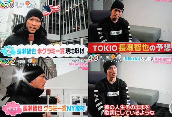去年に引き続き、休暇を取って、生中継をリアタイ。まずは、達ちゃんとのカラミが楽しみなZIP!~って思ってたのに、生中継は無し。街頭ロケと室内でのインタビュー映像。寒そうだな~って、思ってたら、生中継では、昨日までは寒かったけど、今日は、雨が降っているけど、9℃くらいという事で、東京と変わらないくらい、というか、ココ最近、東京は寒いからNYの方が暖かいぐらいでヨカッタよ~♪割と長く時間を取ってくれてたけど、街頭インタビュー映像とかで、智也の出番は、思ったより多くなかったけど、明日も、やってくれるというので、期待してますよ~♪「news ever」で、オープニングに慶ちゃんがいないなぁと思ったら、NYからの中継で、ナンとNEWS4人でグラミー賞受賞式観覧してたという事で、ビックリ。他にも、誰かいたのかなぁ?