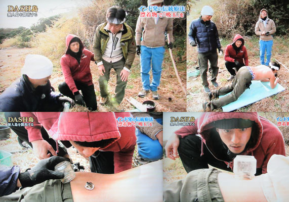 今回、ナンで達ちゃんはいなかったんだろう?風邪ひいてた時の撮影なのかな?G3とリーダーの撮影、ま、こうなるよねっていう感じで、楽しかった~♪吸玉説明してる時に、太一が、プロレスラー藤波さんに跡があったっていうと、すぐ判って笑顔になる智也やリーダー。彼らには共通言語がたくさんあるんだって、あらためて、嬉しくなる♪「ドコが痛いの?」とマボが訊くと「腰!」と即答リーダー。「慢性的になっちゃってんだよぉ」って心配してる太一に、マボは「リアルなヤツかよ!」って言ってたけど、やっぱりネタ的にやる企画も、DASHにはあるって事よね。ま、テレビだからね。「寝て!」って、リーダーに触れながらも、命令(?)する智也が面白い(*'ー'*)ふふっ♪そして、リーダーの体を観て「ゆるい身体になってきたね~」。そうだよね、智也は頑張ってるんだもね( ̄~ ̄)ξ 火を付けるのにフーフーする際に、ボーカルがなんたらとかって、ナレーションあったけど、ちょっと最近、ミュージシャンっていう事が、ネタ的に扱われるのに、気持ちが良くないんだよ…。ε-(;ーωー)フゥ…。 0円の食材ゲットで、物越しのまなざしがキリリと素敵なように、今回も、汚れた瓶(使う前に洗えばよかったのにー!)越しの智也の綺麗な瞳に、(* ̄。 ̄*)ウットリ…♪