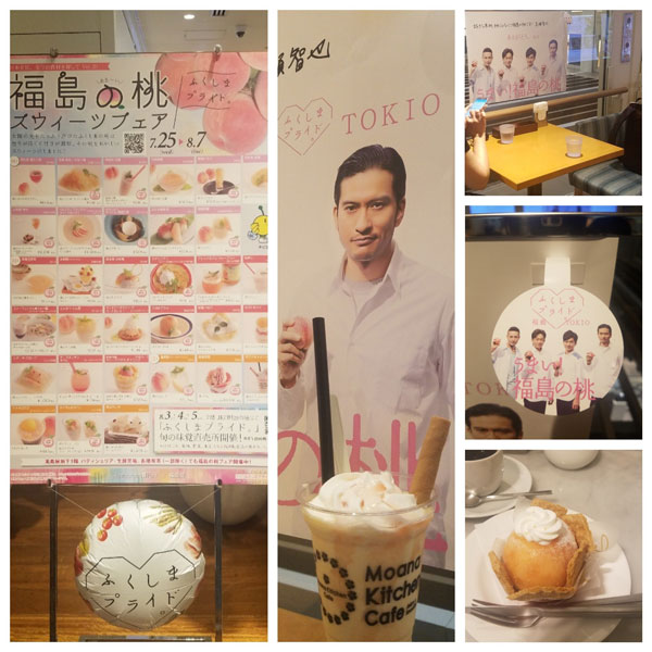 最近、朝起きた時からの頭痛が続いて、ヤダなぁと思いつつ、今日は桃三昧するぞーという日だったので、“o(* ̄o ̄)o”ウキウキ♪おでかけ。薄曇りで、風が爽やかで気持ちよくて。お昼前の空いてる間に、さっさと食べようと、まずは、お目当ての桃パイ。聴いてた通り、桃まるごと一個を使った、食べ応えのあるケーキ。桃の真ん中には濃厚なカスタード。周りに付けられたパイは、甘くなく、バランスがバッチリ。それから、ズラッと並んだ、各店の桃スィーツを観ながら、ポスターが無いと聴いていたレストラン街へ移動。そうしたら、ドーン!と、ふくしまプライド桃バージョンポスターがあちこちに貼られててラッキー♪そして、ポスターが真横に貼られてる、絶好の座席があるカフェで、桃スムージー。コレ、先ほどの桃パイ540円より高いんですけど(800円)…。ま、ココは場所代?って事で。各ポスターに貼られてる、丸いポップ(?)が欲しい…!