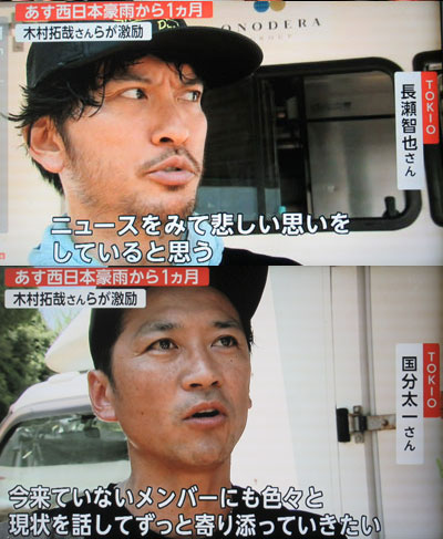 大きな力だよね、逢いに行くって事。今回は、調理しながらの配布じゃなかったようだから、この暑い中、火の前に立たなくて良かった~。…っていうか、Zettai、ダメだよね、こんなに暑かったら。インタビュー受けた男の子の「長瀬くんからもらいました。嬉しかったです」という言葉だったり、年配の女性が「“ありがとう”言うたら、“頑張ってください”って言うてくださった。長生きできます」と、満面の笑みで答えてるのを見たら、こっちも嬉しくなってくる。智也がインタビューで「苦しくなりますよね」って。「それは僕らだけではなくて、ホント、日本全国の皆さんもね、やっぱ、そういうニュースを観てね、きっと悲しい想いをしてる人もたくさんいると思うんですね」スゴいよね、智也の言葉は。自分達のやってる事が特別じゃないっていうように謙遜してる。太一は「自分たちに出来る事はどういう事なのか、今、来ていない、他の自分たちのメンバーにもいろいろとこの現状を話して、ずっと寄り添って行けたらなと思ってます」木村先輩が事務所のタレントは男ばかりで力仕事出来るから、がれきの撤去にも来たいっていうようなコメントしてて。確かに、必要なのは、そういう手なのかも知れないんだけど、これ以上、TOKIOが作業しなくちゃいけないことが増えるのは、カンベンして欲しいって思えちゃうんだよね、申し訳ないけど…。