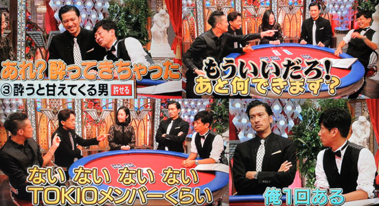 やっぱり、トーク中心がいいよね~。TOKIOと初からみだっけ?いろいろ番宣に出てるのを見たような気がするけど、割とノリ良かったような印象だったので、今回も、予告の時点から楽しみでした。そういう雰囲気もあったせいなのか、太一がナンかはしゃいでたような。酔ったマネして智也に寄りかかるヤツ、昔、メントレでよく、マボが智也相手にやってたなぁって、スゴく懐かしくなりました。智也って、いつもそういう役周りよね~。太一に寄りかかられてる智也の表情がたまんない( *´艸`)モノマネ振って、女優さんなのに、やってくれるのは、さすが関西出身!って思うんだけど、これもみんながみんな、そうじゃない!って言われちゃうかな(* ̄∇ ̄*)。マボにツッコまれてる太一の笑顔に、こっちまで楽しくなってきちゃう♪お家に御呼ばれしたことあるかっていう、リーダーの質問、(*^ー゚)b グッジョブ!!太一が、たけしさんの家に行った話って、聴いたことあったっけなぁ?でも、太一は割と大御所のお宅へお呼ばれしてたような…?