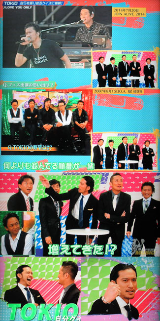 同じく2016年11月の「魁!ミュージック」は「クイズ俺!」と、TOKIO自身に関するクイズをするというヤツ。『愛!wanna be with you...』プロモなので、「愛」とついた楽曲が何曲あるかとか、サマソニの会場では、ナニステージだったか?という事で、サマソニの思い出から、初野外LIVEのJOIN ALIVEの話になり、その映像が出て。「本日、未熟者」のプロモで出た時のVTRが出たら、その並びが、今回と一緒という事や、その時していたネックレスと一緒のをしてた達ちゃんとか、リーダーのオデコを観て、留まってるとか(* ̄m ̄)。サマソニのステージの名前は智也がちゃんと覚えていて、当たったからガッツポーズ。この時しているブレスレットは、GOETHE最新号で付けてるヤツね。全問正解で50秒の告知時間をゲットしたけど、45秒は、この番組の感想とか、打ち上げしようっていう、わちゃわちゃトークで、最後の5秒で「11月30日、『愛!wanna be with you...』、是非皆さん、聴いて下さい」でピッタリ50秒。「以上、TOKIOでした~」はオマケ。何度観ても、楽しいです。こういう音楽番組終わっちゃって、残念だなぁ…。