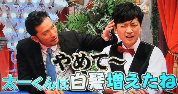 この、太一の髪の毛を優しく触る綺麗な手に、(* ̄。 ̄*)ウットリです。そして、見つめる優しい瞳にトロケます。でも、「白髪スゴ~い」って追い打ち!「やめて…」「童顔で売ってんだからやめて」って言ってる太一に爆笑です。グレイヘアーが話題になってるけど、さすがにジャニーズでは難しいかなぁ。吉川晃司とか、陣内孝則とか、グレイヘアーになってる人を見ると、悪くないとも思うんですけどね~。「童顔」だから、髪とのギャップが難しいかな~。あ、やっぱりカットされたね、待ち合わせ事情…。