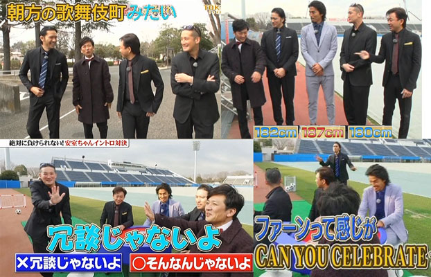 始まる前まで、ナンかまた、迷走するんじゃないかと思ったのが、ヘンなVTRをたくさん見せられるより遥かに楽しいものになってる「出張トキカケ」。確かに、こういう風にすると、番宣出演が多いゲストとは違うタイプのゲストを呼べて、そして、TOKIOはそういう人たちとトークすることに長けてるから、めっちゃ楽しい番組になるんだよね♪そして私達ファンは、全身たっぷり見れて、ワイワイ楽しく、そして結束する彼らを堪能出来るという。ホントにこのロケに遭遇したいなぁ…。こんなにカッコいい人が勢揃い…。安室ちゃん曲限定のイントロクイズ。ゲストに忖度してる感じを垣間見つつ…。智也が1フレーズ、ファルセットで歌ってラッキー♪この格好も可愛いし!