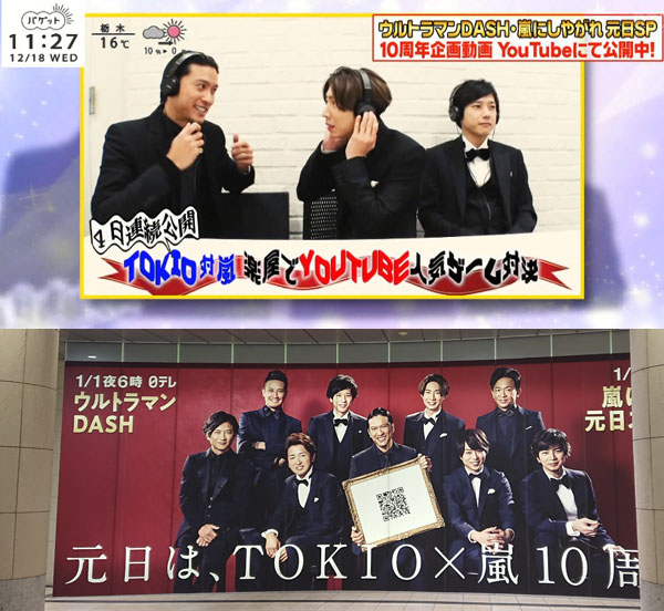 火曜日の夜に体の節々が痛くなり、アレ??と思っていたら、みるみる体温上昇。翌日病院に行くも、インフルは陰性。風邪薬を貰って一旦は下がったものの、夜にはまた上昇。で、結局毎年恒例となりつつあるインフルエンザA型発症。予防接種受けろって話ですけどね…。で、いろいろ後手に回っていて、ようやく録画やら情報チェックして回収作業中。水曜日の「バケット」ではTOKIO嵐のYouTube企画を告知してくれてました。青木アナが「やはりTOKIO兄さんだけに見せる、嵐の皆さんの表情っていうのがやっぱいいですよね。TOKIOと嵐の関係っていうのを観てですね、元日のスペシャルに向けて気分を高めて頂きたいと思います。なかなかTVでは見られないような表情が観られると思います」とコメント。元日の放送まで見られるって言ってるけど、放送直前まで?放送終了まで??どっちだろ?…で、ようやく汐留にも行けて、デッカいポスター、目に焼き付けてきました。笑顔もいいんだけど、やっぱりキリリの方が好きだなぁ。この風物詩も見納めかな…。