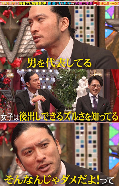 昨日は朝から頭痛で、ランチ後たまらず、昼寝をしたら、ナンともリアルな夢を観た。カフェでお茶をしながら外を見てたら、太一が男性と歩いてて、いかにもプライベートな感じだったから、思わず追いかけ、捕まえ(ココまでに、夢らしいヘンないきさつがあったけど、省略)、訊きたい事「TOKIO消滅なのか」をぶつけたら「うん」と。で、何故、ファンに説明しないのかと問い詰めると、ファンの気持ちを全然判って無い回答が来てブーイング。経緯を説明して欲しいというと、太一が紙に書きながら説明しようとしたトコで眼が覚めた。夢の中での、太一の回答は、4人になった時に既に決まっていたと。…これは私が潜在的に思っていることなんだろうな。コレが正夢になるのか…。